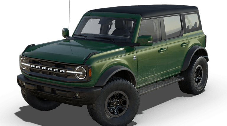 2025 Bronco 4D Sport Utility Outer Banks 4WD Bronco Outer Banks Advanced In-Transit, 4D Sport Utility, 2.7L EcoBoost V6, 10-Speed Automatic, 4WD, Green Metallic, Black Leather, 360-Degree Camera, 4.7 Final Drive Ratio, 8 Speakers, Adaptive Cruise Control, AM/FM radio: SiriusXM with 360L, Equipment Group 314A Lux Package, Evasive Steering Assist, Front Parking Sensors, Hard Top Sound Deadening Headliner, High Clearance Fender Flares, High Clearance Suspension, Information on Demand Panel, Position-Sensitive Bilstein Shock Absorbers, Radio: B&O Sound System by Bang & Olufsen, Rear-Window Defroster & Washer, Sasquatch Package, Shadow Black-Painted Hard Top, Sideview Mirrors, Steering wheel mounted audio controls, SYNC 4, Trailer Tow Package (DIO), Universal Garage Door Opener, Wheels: 17 Black High Gloss-Painted Aluminum (64X).