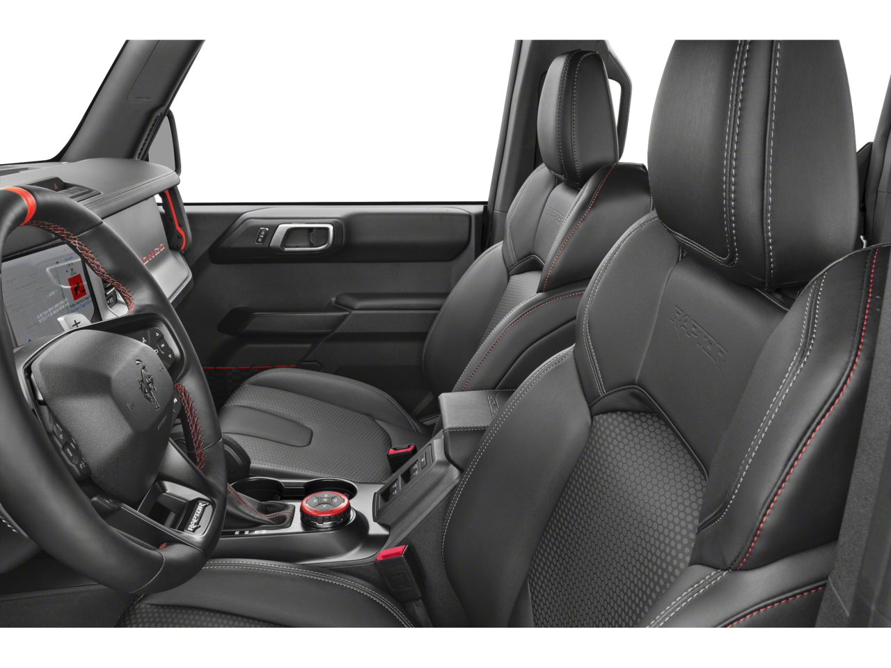 - Built for drivers who demand the absolute peak of off-road performance, this 2026 Ford Bronco Raptor 4-Door 4x4 delivers extreme capability wrapped in unmistakable style. Finished in stunning Ruby Red Metallic Tinted Clearcoat with aggressive Raptor graphics and black fender flares, this Bronco Raptor commands attention from every angle. The gray molded-in-color hard top with sound-deadening headliner provides year-round versatility while maintaining the rugged, trail-ready look that defines the Raptor name. Under the hood, the high-output 3.0L EcoBoost V6 engine pairs with a 10-speed automatic transmission to deliver relentless power and precision. Equipped with 37x12.5R17 all-terrain tires mounted on 17-inch black high-gloss painted alloy wheels, this Bronco Raptor is built to conquer demanding terrain. The advanced 4x4 system, front and rear locking differentials, 4.7 rear axle ratio, and front stabilizer bar disconnect work seamlessly with the HOSS 4.0 Suspension System featuring FOX Live Valve dampers to provide exceptional articulation, control, and high-speed desert performance. Full heavy-duty metal bash plates, modular front bumper with RIGID fog lamps, powder-coated steel rear bumper, and integrated tow hooks reinforce its serious off-road credentials. Inside, the cabin blends durability with premium comfort. Leather-trimmed/vinyl black seats provide supportive bolstering for aggressive driving while maintaining easy-clean practicality. A 12-inch center display and digital cluster create a modern, driver-focused cockpit, complemented by a full-display rearview mirror and 360-degree camera system for added confidence on and off the trail. The sport leather-wrapped steering wheel with paddle shifters, auxiliary switches with pre-wiring, MOLLE strap system, smart-charging USB ports, and multiple 12V powerpoints make this Bronco as functional as it is refined. Technology and convenience features include the LUX Package, Ford App connectivity with one year included, Terrain Management System with G.O.A.T. Modes, Pre-Collision Assist with Automatic Emergency Braking, and a full suite of stability and traction control systems. Advanced safety features such as AdvanceTrac with RSC, the Safety Canopy System, individual tire pressure monitoring, and perimeter alarm add peace of mind wherever the roador trailtakes you. From reinforced swing gate and rock rails with removable running boards to its bold magnetic/black grille and signature LED lighting, every detail of this 2026 Bronco Raptor is engineered with purpose. Its not just an SUVits a factory-built performance off-road machine ready to dominate dunes, trails, and everything in between.