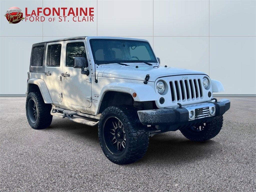 - Adventure is calling in this 2018 Jeep Wrangler JK Unlimited Sahara 4x4, finished in Bright White Clear Coat with a bold Black cloth interior. Built with legendary Jeep capability and iconic style, this four-door Wrangler is ready for everything from daily drives to weekend trail rides. Under the hood, you’ll find the proven 3.6L V6 24-valve VVT engine paired with a smooth-shifting 5-speed automatic transmission, delivering strong performance both on and off the pavement. The Command-Trac® shift-on-the-fly part-time 4WD system, Next Generation Dana® 44 heavy-duty rear axle, Dana® 30 solid front axle, and 3.21 axle ratio provide the durability and traction Jeep is known for. With skid plates protecting the transfer case and fuel tank, plus Hill Start Assist, Hill Descent Control, Electronic Stability Control, and Trailer Sway Damping, this Wrangler is engineered for confidence in a variety of driving conditions. The Sahara trim adds refined styling and comfort to its rugged capability. Exterior highlights include 18-inch polished wheels with Granite Crystal pockets, all-terrain on/off-road tires, LED fog lamps, LED reflector headlamps, body-color fender flares, Fine Silver Metallic bumper accents, tubular side steps, and the signature “Trail Rated” badge. It also features both the Freedom Top® 3-piece hard top and the Premium Black Sunrider® soft top as part of the Dual Top Group, giving you the flexibility to enjoy open-air freedom your way year-round. Deep tint sunscreen windows, automatic headlamps, heated power mirrors, and multiple tow hooks round out the exterior functionality. Inside, the cabin blends classic Jeep character with modern convenience. Enjoy cloth seats with adjustable head restraints, a leather-wrapped steering wheel, steering wheel-mounted audio controls, air conditioning, power windows with one-touch down, power door locks, and a driver seat height adjuster. The rear 60/40 folding seat and covered rear storage compartment add versatility for cargo and passengers alike. Technology features include the Radio 430 NAV system with GPS navigation, a 6.5-inch touchscreen display, 40GB hard drive, SiriusXM® capability, Uconnect® Voice Command with Bluetooth®, and an Electronic Vehicle Information Center. An auto-dimming mirror with reading lamps, 115-volt auxiliary power outlet, remote keyless entry, security alarm, remote start system, and tire pressure monitoring display add everyday convenience. With its unmistakable design, open-air capability, and true 4x4 heritage, this 2018 Jeep Wrangler JK Unlimited Sahara is built for drivers who want freedom, versatility, and iconic Jeep performance in one rugged package.