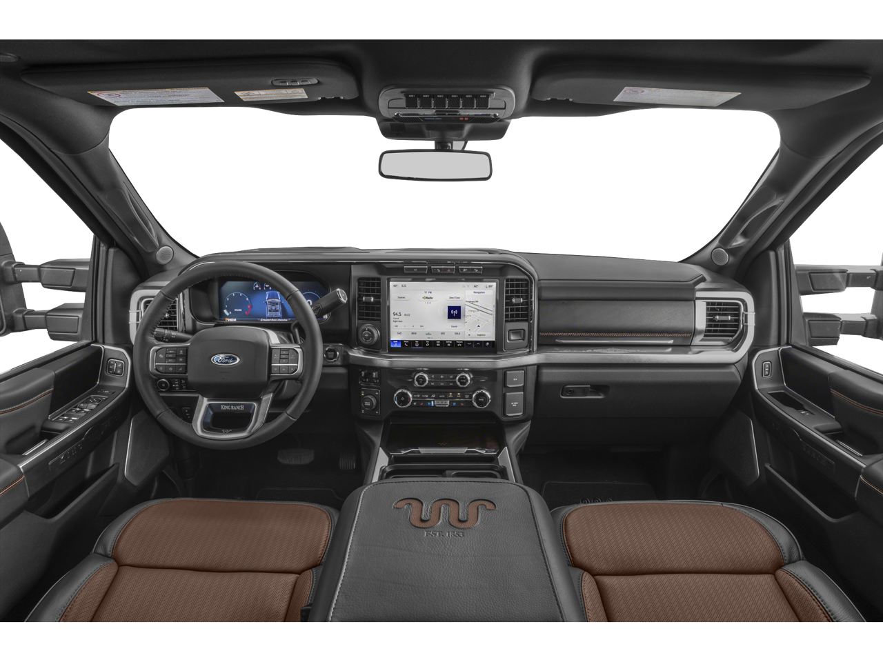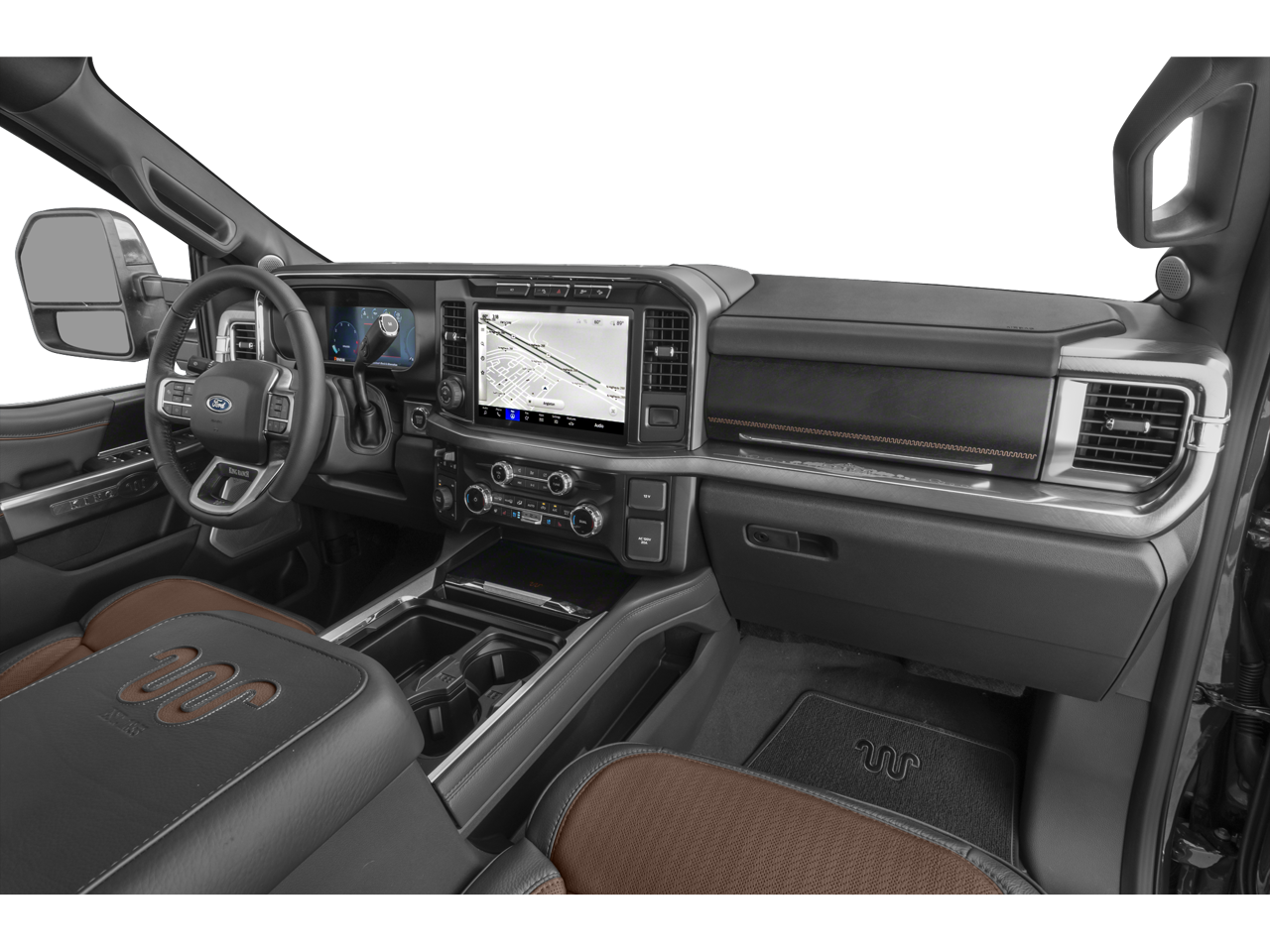 - This 2025 Ford F-350 Super Duty King Ranch SRW 4x4 Crew Cab blends premium Western-inspired luxury with serious heavy-duty capability, making it just as comfortable on the jobsite as it is on the highway. Finished in a striking Darkened Bronze exterior, this truck commands attention with its bold stance, chrome accents, and 20-inch chrome PVD aluminum wheels, while signature LED lighting, rain-sensing wipers, and power-deployable running boards add both style and everyday convenience. Under the hood, it’s powered by the legendary 6.7L High Output Power Stroke® diesel engine paired with a smooth-shifting 10-speed TorqShift automatic transmission, delivering exceptional towing strength and performance. Equipped with a gooseneck hitch kit, 5th wheel prep package, trailer brake controller, and Pro Power Onboard (2kW), this F-350 is built to handle demanding workloads with ease. Features like trailer sway control, tow hooks, and a 360-degree camera system help provide added confidence whether you’re hauling equipment or navigating tight spaces. Inside, the King Ranch interior showcases rich Java leather seating with distinctive craftsmanship, offering a refined cabin experience. Multi-contour front seats, a heated leather-wrapped steering wheel, dual-zone automatic climate control, and a power tilt/telescoping steering column with memory settings ensure comfort on every drive. The spacious crew cab layout provides ample room for passengers, while thoughtful details and premium materials elevate every moment behind the wheel. Technology is front and center with a large 12-inch touchscreen powered by SYNC® 4, complete with enhanced voice recognition, connected navigation, and wireless charging. The B&O Unleashed sound system delivers an immersive audio experience, while features like a head-up display, adaptive cruise control, FordPass Connect with 5G Wi-Fi capability, and a 12-inch productivity screen keep you informed and connected wherever the road takes you. Additional highlights include a spray-in bedliner, wheel well liners, roof clearance lights, upfitter switches, and vinyl flooring for durability, making this truck ready for real-world use while maintaining its upscale feel. With its combination of rugged capability, advanced technology, and King Ranch luxury, this F-350 stands out as a powerful and refined heavy-duty pickup built to exceed expectations.